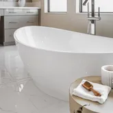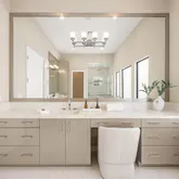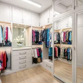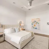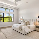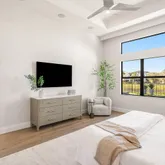 In the primary suite, serenity prevails. Gorgeous lake views spill into the space with custom closets soaring to the ceiling, and automated premium blackout shades to create an atmosphere of indulgent privacy. The bathroom feels like a boutique spa- anchored by a freestanding soaking tub, precise Kohler fixtures, a rain shower, and refined, modern vanities with the highest-level glossed cabinetry illuminated by soft, architectural light.