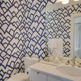 - Room Description: The primary bedroom has large windows and a charming bath with designer wall coverings, light fixtures, and tiles.