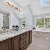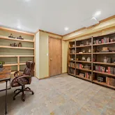 Inside, the layout is smart and inviting. The first-floor primary suite features a marble-clad bath with a Jacuzzi tub, while the high-end kitchen, complete with custom cabinetry and a professional-grade chef’s stove, anchors the main living space. A vaulted great room brings in loads of natural light through oversized windows, and the dedicated office—fitted with built-ins—adds function without sacrificing flow.