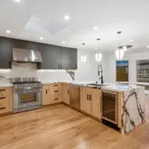 - Kitchen Features: Breakfast Area, Island, Island w/Sink, Kitchen/Family Combo, Marble Counter, Skylight(s), Stone Counter