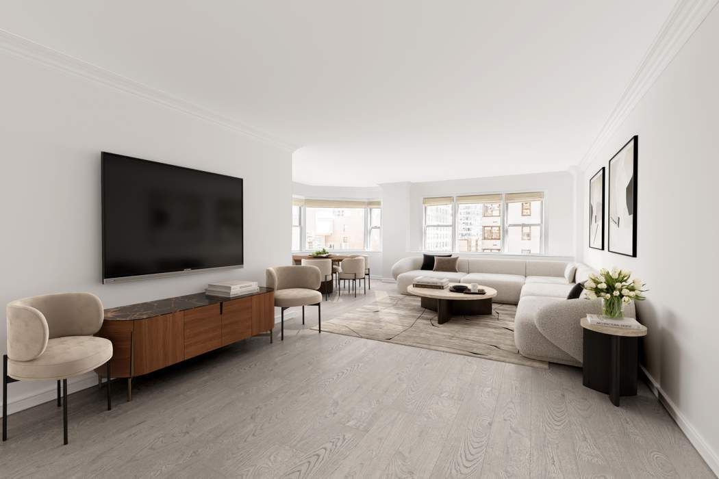 This expansive split two-bedroom, two-bathroom residence is bathed in extraordinary natural light and located in a full-service postwar building on a picturesque, tree-lined block. Upon entry, a welcoming gallery with a coat closet leads into a stunning 27-foot-long open-concept living and dining area. Ideal for entertaining, the space features generous wall space for art and a dining alcove with oversized east- and north-facing bay windows that...Exceptional Light and Space in a Full-Service Building