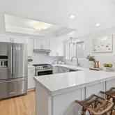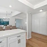 The remodeled kitchen connects directly to the dining area and features quartz countertops, stainless steel appliances, a breakfast bar, and abundant cabinetry designed for both daily living and casual gatherings.
