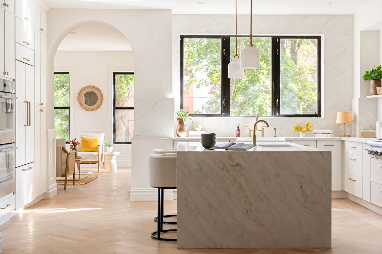 The parlor level opens into a spacious, sun-filled living and dining area with soaring 10.5’ ceilings and oversized windows. The showstopping chef’s kitchen features an expansive island, abundant counter space, and a premium appliance suite that includes a paneled Bosch refrigerator and dishwasher, a five-burner Thermador cooktop and double oven, and microwave drawer — perfect for both entertaining and casual family meals. A quiet den at the rear of the floor offers seamless access to a deck overlooking the serene garden, creating an ideal indoor-outdoor flow.