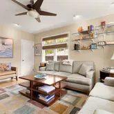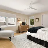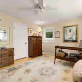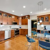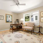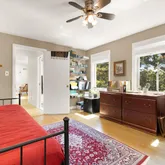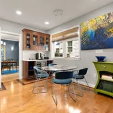 The den, large enough to serve as a main-level bedroom, is complemented by a brand-new, spa-like bathroom. The kitchen is a chef’s dream, with top-of-the-line cabinetry, stainless steel appliances, a wine fridge, and an oversized pantry—perfect for both cooking and entertaining.