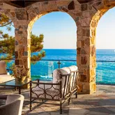 bathrooms and closets, opens onto a balcony overlooking the crashing waves below. There are