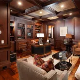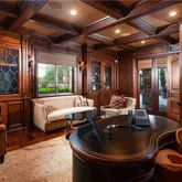 room, a large formal dining room and handsome wood paneled office. Walls of glass open