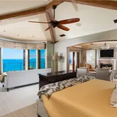 allowing head on views of the ocean beyond. On the top floor, the primary bedroom, with dual
