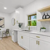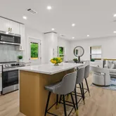 - Kitchen Features: Breakfast Bar, Cabinets White, Kitchen Island, Stone Counters, View to Family Room