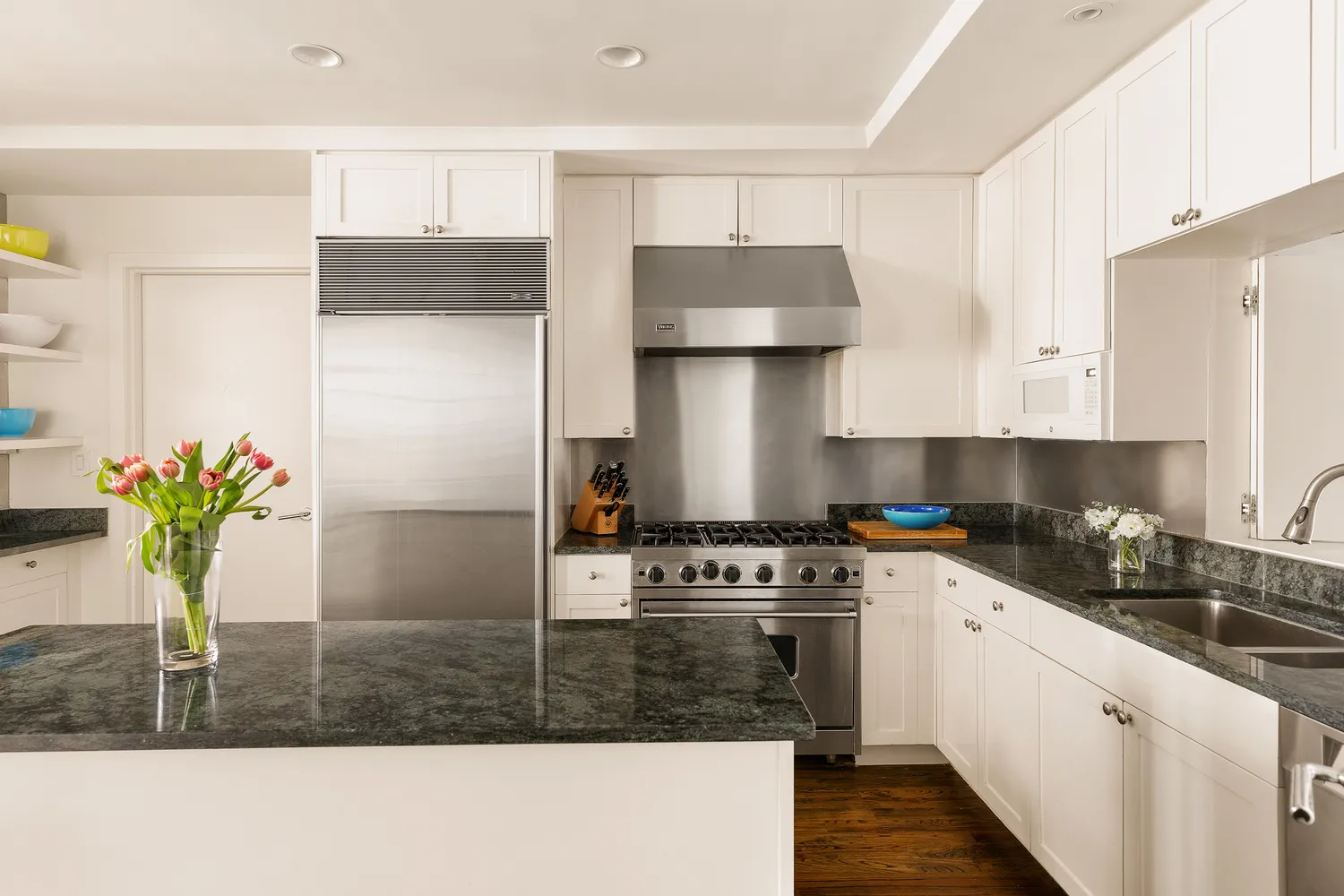 The additional bedrooms are generously proportioned, each offering custom California closets, light and most importantly, a quiet, relaxing environment. An additional bedroom is currently configured as an office with built-ins and workstation ideal for working from home.