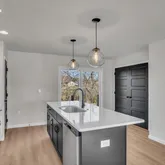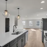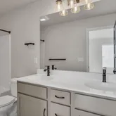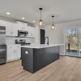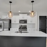 Spacious Kitchen with a large island, quartz countertops in Arctic White, sleek matte black Moen pull-down faucet, upgraded stainless steel appliances, and classic subway tile backsplash. Heritage cabinetry package in Dakota White with Onyx Black island accent, complete with upgraded hardware for a polished, modern look. Open-concept dining and family room finished in warm Nutmeg luxury vinyl plank flooring, perfect for entertaining or everyday living. Owner’s suite retreat featuring dual vanities with cultured marble tops, upgraded cabinetry, and a spacious fiberglass tub/shower. Secondary bedrooms with upgraded carpet and generous closet space. Powder room with a pedestal sink and matte black Moen accessories. Laundry room convenience with wire shelving and included washer/dryer package. Exterior Details:
