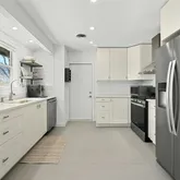 The fully renovated kitchen is both stylish and functional, featuring sleek cabinetry, quartz countertops,