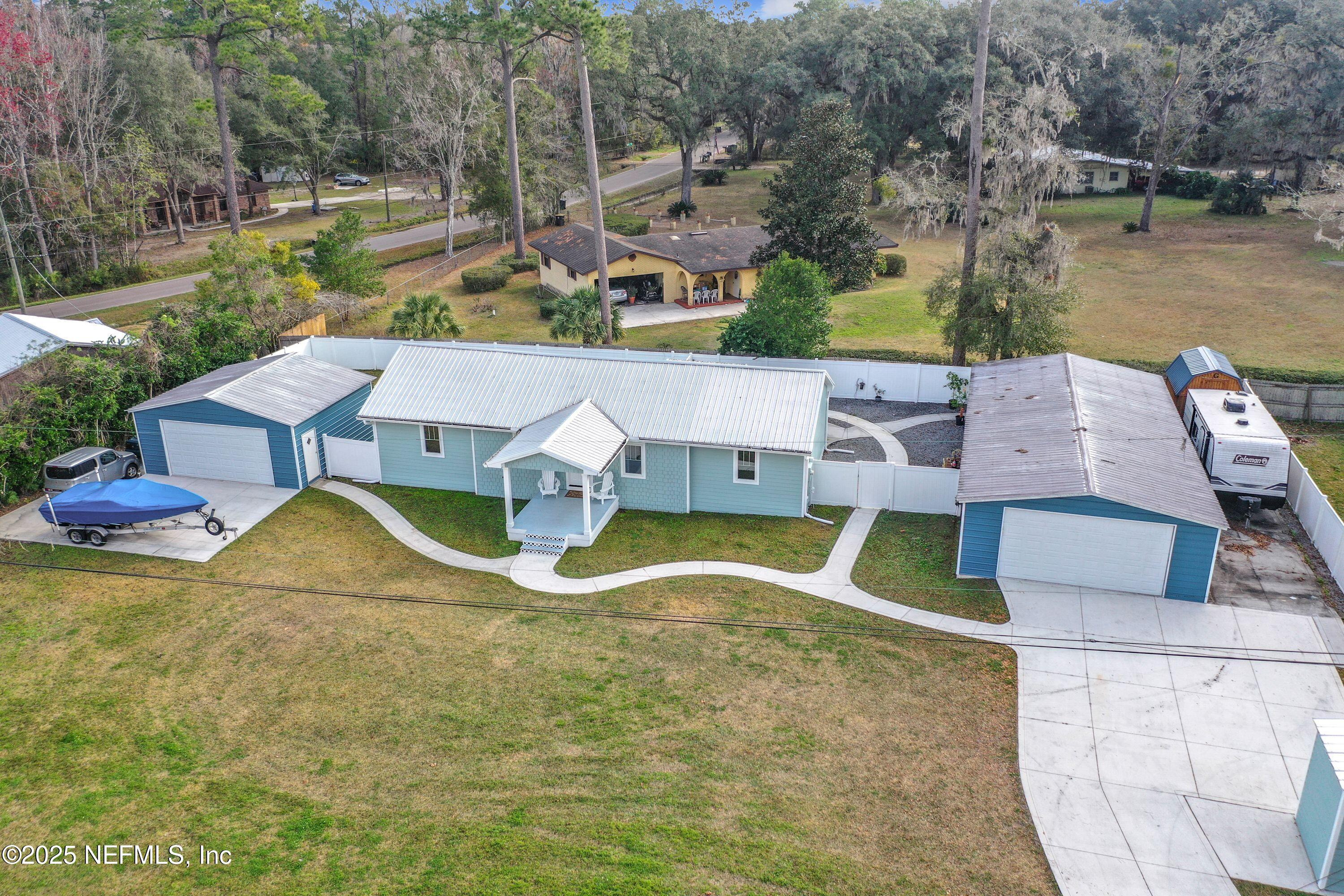 - General Property Information: Public Remarks: WHY PAY STORAGE FEES? Located in Rudd's 4E Ranch near mile marker #3 of the BALDWIN TRAIL! This Beautifully Remodeled Home on a Half Acre also has Garage Space for up to 6 Cars and several RV's! Perfect for the Car Enthusiast, Business Owner needing Equipment / Supply Storage, or Sports Enthusiasts needing Toy Storage! 80 FT LONG DRIVEWAY! Gym Area behind one of the garages! The Seller is a contractor and you will LOVE this 2BR / 2BA Home with Fabulous Updated Baths and a New Designer Kitchen complete with White Wood Cabinets, Quartz Tops, and Matching Full-Height Backsplash! LVP Flooring throughout with 12 ft Cathedral ceilings at each end of the home! Step outside your back door and immerse yourself in some Tranquil Country Living. Here you will find 2 distinct Fenced Areas that can be customized as needed. This Property is located about 3 miles West of 295, yet it is conveniently close to all Jacksonville has to offer! Hurry and make this property yours before it's Gone!