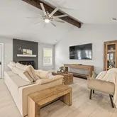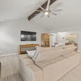 - Interior Features: Beamed Ceilings, Open Beams Beamed Ceailings, Ceiling Fan(s), Separate Formal Dining Room, Double Vanity, Eat In Kitchen, High Ceilings, Kitchen Island, Multiple Dining Areas, Main Level Master, No Interior Steps, Open Floorplan, Quartz Counters, Recessed Lighting, Vaulted Ceilings, Walk In Closets