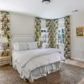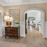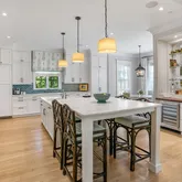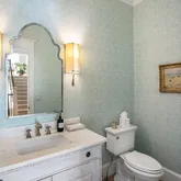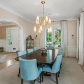 Erica Burns was responsible for the interior design, combining more formal front rooms enhanced with Old World brass-and-gold accents with contemporary light fixtures and white oak flooring, creating a very current and very chic aesthetic throughout. The open-plan kitchen with center island connects to an eat-in dining space as well as to the great room with coffered ceiling and fireplace. Bi-fold patio doors between the great room and back terrace can be fully opened, allowing for integrated indoor/outdoor entertaining