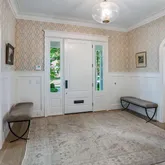 A whitewashed brick facade and columned front porch with shuttered French doors is topped by a decorative Chippendale-style balustrade. The generously-scaled entry foyer opens to the dining room and Library/Living Room through arched case openings. The Library/Living Room is complete with back-lit bookcases and gas fireplace and can be sealed off with glass-paned pocket doors.