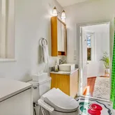 The kitchen on this level retains its original charm, with classic cabinetry and plenty of counter space for preparing meals and everyday living. The kitchen is functional and ready for your personal touch. Adjacent to the kitchen is a convenient half bath, also updated with modern fixtures, offering added convenience for guests.