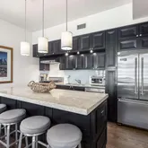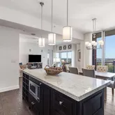 - Kitchen Features: Cabinets Stain, Eat-in Kitchen, Kitchen Island, Solid Surface Counters, Stone Counters, View to Family Room