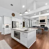 waterproof bamboo flooring, and a floor-to-ceiling stone fireplace with built-ins. The gourmet kitchen offers expansive