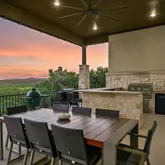 Napoleon grill, stone countertops, and bar seating—perfect for Hill Country sunsets. Pool rendering available.