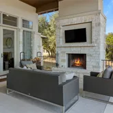 space. Outdoor living shines with a 1,100+ sq ft covered terrace featuring a gas fireplace and outdoor kitchen with