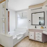 - Room Bathroom Features: Corian Counters, Exhaust fan(s), Linen Closet/Storage, Vanity area, Shower in Tub