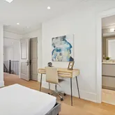 Also on this floor is the second bedroom, with a custom closet and ensuite bathroom, featuring a soaking tub, marble tile, and waterworks fixtures. A conveniently located laundry room, with full size side by side laundry machines, custom storage, and creating a natural separation from the primary suite.