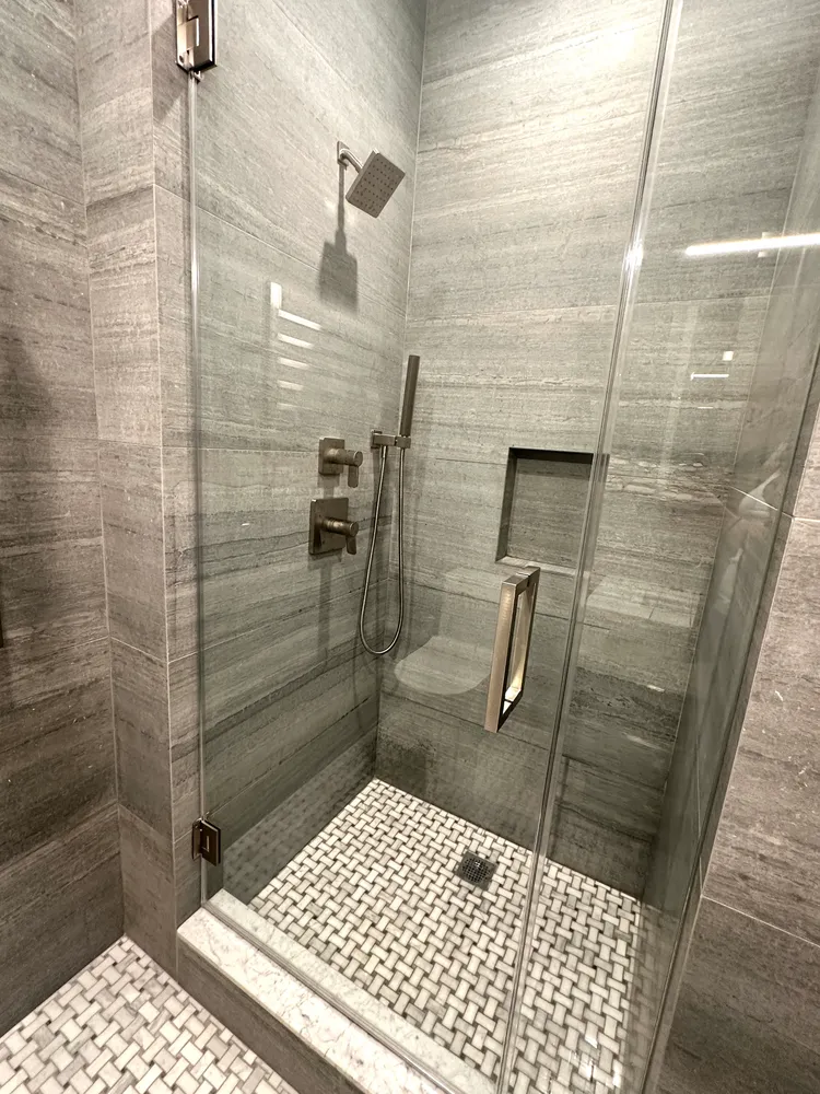 The bathroom is adorned with Statuarietto marble walls and Grigio Nicola mosaic floors, creating a serene oasis. It is finished with Restoration Hardware fixtures, a thoughtfully designed shower, heated floors, and a towel warmer, ensuring a luxurious retreat for ultimate relaxation.
