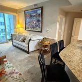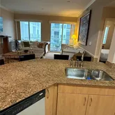 Spacious modern condo featuring a split floor plan, high ceilings, and spectacular city views. The kitchen offers stainless steel appliances and bar seating. Includes in-unit washer/dryer and covered indoor parking space. Building amenities: rooftop pool, lap pool, gym, Pilates area, movie theater, party room, business center, and 24-hour security. Pet-friendly community located steps from Young Circle, near golf, restaurants, and Downtown Hollywood nightlife.