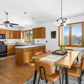 - RoomDescription: Oak cabinets, cathedral ceilings, and new light fixture.