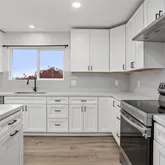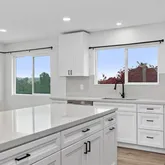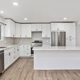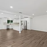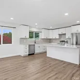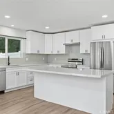 greeted by a beautifully remodeled kitchen, complete with new appliances, cabinets, and quartz countertops. The kitchen seamlessly flows into the