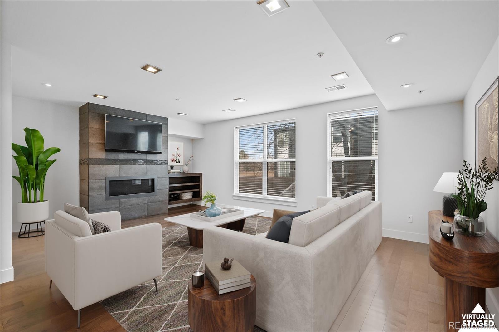 Upstairs, two bedrooms and two bathrooms provide well-designed separation...Located in the Sloan’s Lake neighborhood of Denver, this modern 2-bedroom, 2.5-bathroom townhome offers a bright open floor plan, contemporary finishes, and a private attached garage. The main level features a spacious kitchen with quartz countertops, a large island, stainless steel appliances, and a clean backsplash design. An electric fireplace and oversized windows add warmth and natural light throughout the living area.