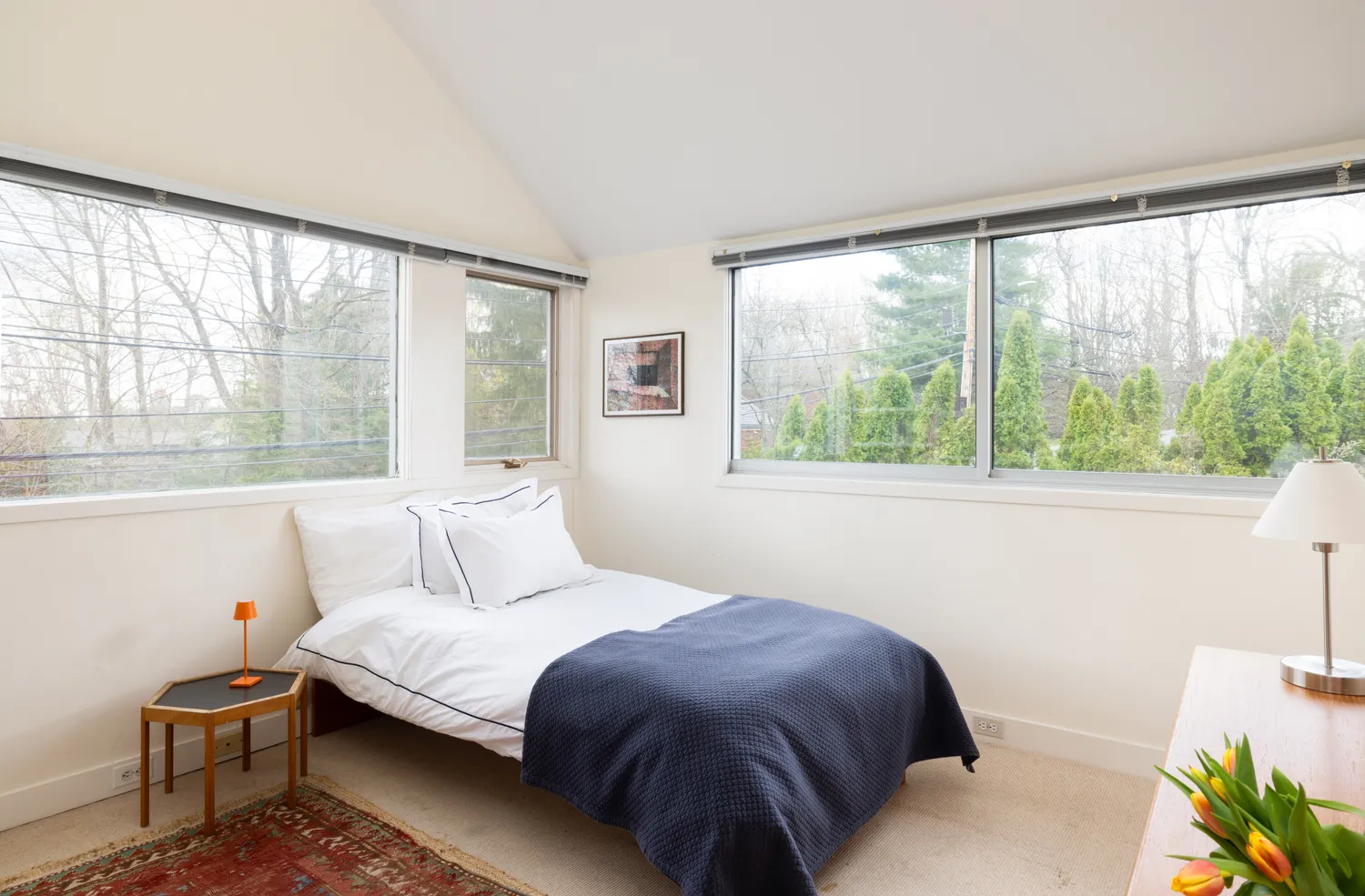 An open central staircase lined with skylights leads to the second floor, where the primary suite is set apart with treetop views, a vaulted ceiling, and an en-suite bath. Two additional bedrooms, a full bath, and laundry complete the upper level. The lower level adds practical space with a mudroom and ample storage. Two car garage on either side of the house and plenty of driveway parking.