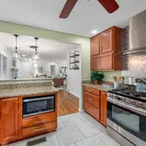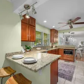 - Kitchen Features: Breakfast Bar, Cabinets Stain, Pantry, Stone Counters, View to Family Room