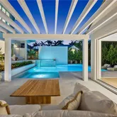 Outdoor Living Area: Spacious living and dining areas, Outdoor kitchen and bar, Pool and spa, Fireplace and outdoor shower.