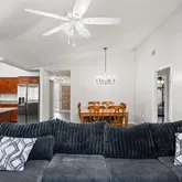 - Interior Features: Cathedral Ceiling(s), Ceiling Fan(s), High Ceilings, Kitchen/Family Room Combo, Living Room/Dining Room Combo, Open Floorplan, Primary Bedroom Main Floor, Stone Counters