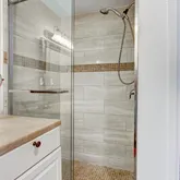 full bath, plus one additional shower and half bath downstairs. Home recently painted, carpet in bedrooms replaced just two years ago, property has