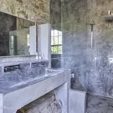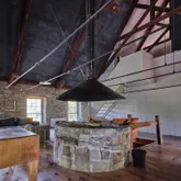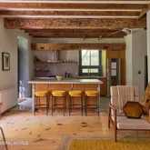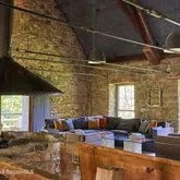 Inside, the dramatic great room unfolds beneath soaring 30-foot ceilings, where exposed beams and original rough-hewn stone walls create a breathtaking sense of scale and history. An open wood-fired stone hearth anchors the space, inviting intimate gatherings beneath cathedral proportions. A wall of glass opens to a deck perched in the trees with views stretching toward the Wallkill River - blurring the line between nature, history and modern luxury.