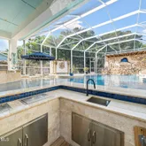 - Pool Features: Gas Heat, Heated, In Ground, Pool Sweep, Salt Water, Screen Enclosure, Solar Heat, Waterfall