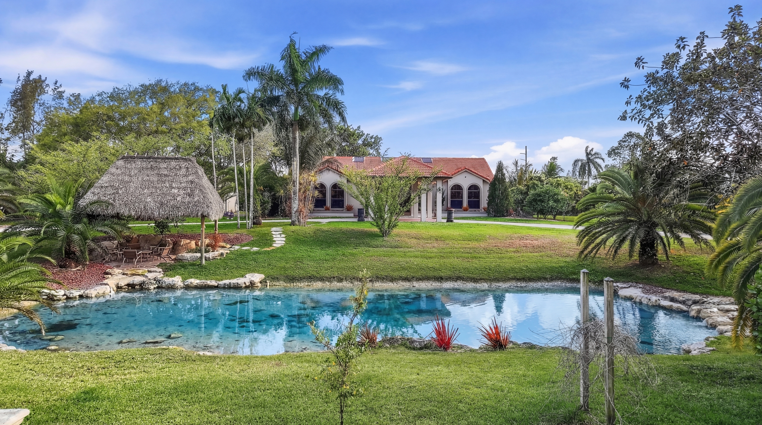 Homes showcases 170 mph-rated tile roof, impact windows and doors throughout the house , 80 solar panels, 20' x 16' tiki hut overlooking pond, natural boulder waterfall feature, porte cochere, and a 900 sf independent guest cottage (1 bed / 1 bath) with a full kitchen, separate meter and separate HVAC.