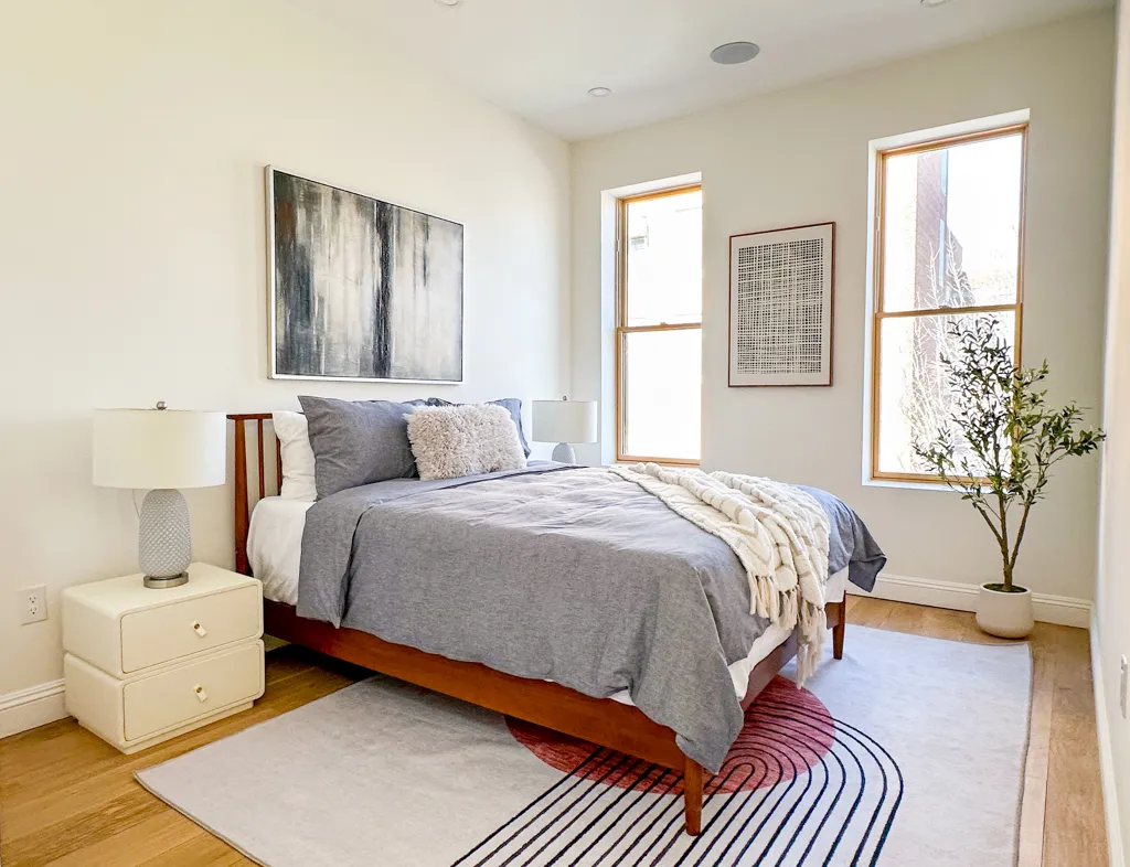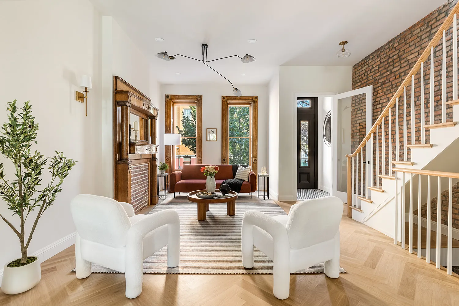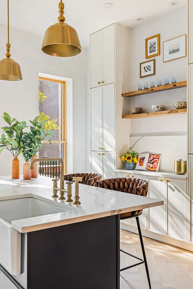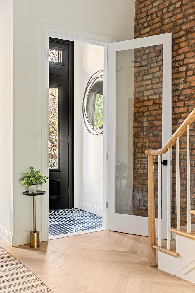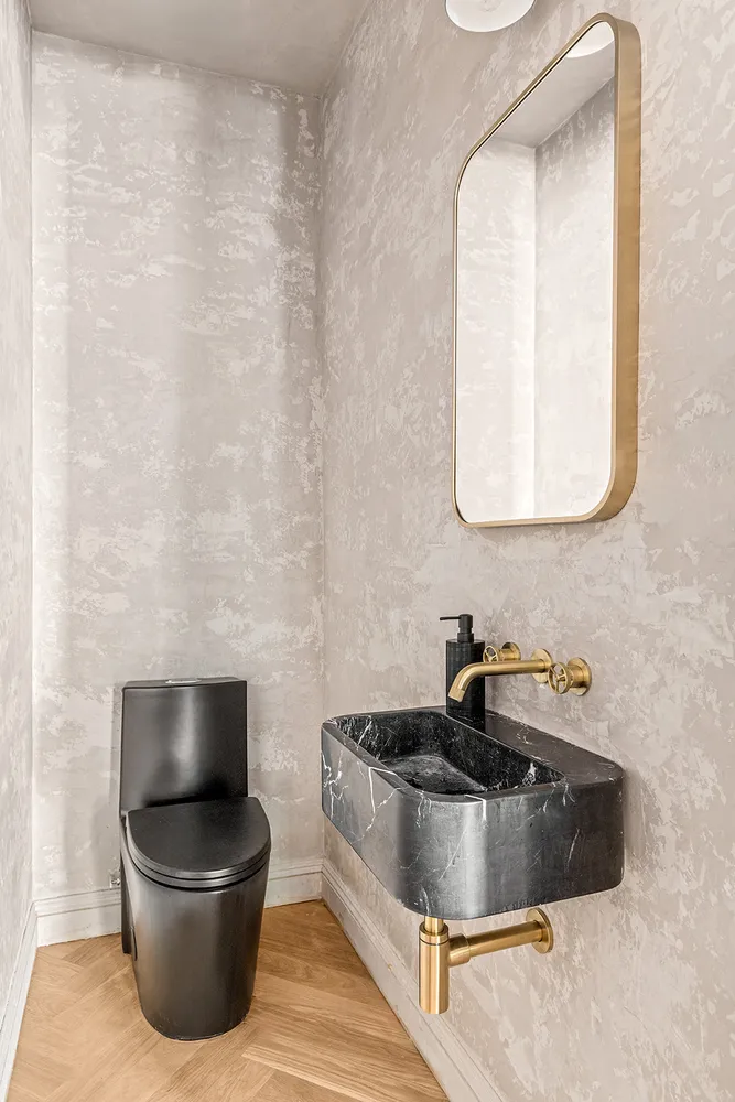 Past the inviting kitchen, a chic powder room combines Venetian plaster walls with a floating black marble sink, sleek gold fixtures, and a striking black toilet. Even the staircase leading upstairs is a showstopper, with its white oak railing, thin white spindles, and exposed brick wall adding to the home’s charm.