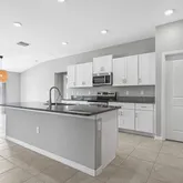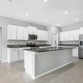 spacious kitchen provides ample storage, modern cabinets, stainless steel appliances, a convenient prep island, and eating space. The combined
