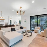 Light-filled interiors flow from the dining area to a chef’s kitchen with book-matched quartz island, Café Series appliances, and walk-in pantry. The spacious living area, anchored by a sleek fireplace, opens through floor-to-ceiling glass to an outdoor kitchen, pool, and turf-lined entertaining area—perfect for gatherings and guests.