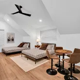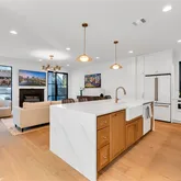 Upstairs, the primary suite includes a private balcony, spa-like bath, and custom walk-in closet. A separate upstairs lounge opens to a balcony with skyline views of downtown Austin and the UT Stadium, while a third-floor rooftop deck showcases panoramic views of the Capitol, UT Tower, Rainey Street, and Lady Bird Lake.