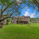 winding decorative stone walls, open stone patio, flower beds, lush green grass, a canopy of oak trees,