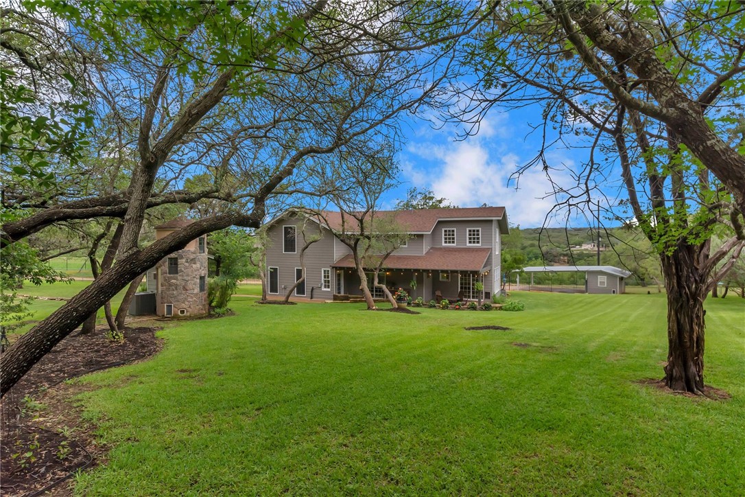 and office/library home includes a covered front porch and covered back stone patio with 4 ceiling fans. The Great Room features wood ceiling beams, hardwood flooring, an open staircase, plantation shutters and French doors to the covered front porch. Formal dining features a large stone wood burning fireplace. Property includes a 38’ X 40' metal out-building with electricity and sink, a 10 foot garage door, and a standard garage door. Perfect for workshop, storing a RV or boat, and much more! All the shelving in the out-building conveys. Property features a free-standing stone "Animal House" for your dogs and cats – complete with AC and heat. Home includes water softener, reverse osmosis system under kitchen sink, solar screens on two sides of the home, and a DVR Security System for the exterior of the property. Renowned Lake Travis ISD! Easy commute to Hill County Galleria and City of Lakeway for restaurants, entertainment, and shopping, including two grocery stores – Texas HEB and Whole Foods. Private well and septic system. Low taxes. No HOA.