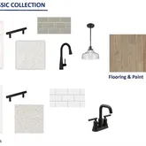 matte black finishes in the kitchen and bathrooms, Pendant lights above kitchen island. GE stainless steel oven, 4 burner gas range with microwave above