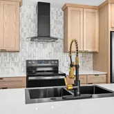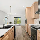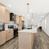 - RoomDescription: Beautifully designed w/Mission Elm/Oak cabinetry, Willow White Quartz Counters & Large Island & black stainless steel appliances.
