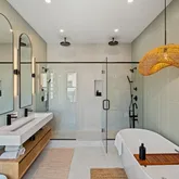 The entire top floor is dedicated to the primary suite, a private sanctuary above the city. Here, soaring ceilings and natural light create an airy retreat. The spa-inspired ensuite features a bespoke glass-enclosed two-person shower, large fluted tiled walls, and a sculptural freestanding tub, blending luxury and tranquility. Custom walk-in closets provide exceptional storage, while direct access to a private terrace offers an intimate outdoor escape for morning coffee or evening relaxation.