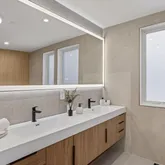 A sculptural floating staircase anchors the interior, complemented by engineered Brazilian Oak wide-plank flooring and expansive natural light. The main level flows seamlessly from living and dining spaces into a chef-caliber kitchen appointed with Porcelanosa cabinetry, Wolf and Sub-Zero appliances, Bosch integration, and genuine soapstone countertops. Private outdoor space extends entertaining beyond the kitchen.