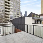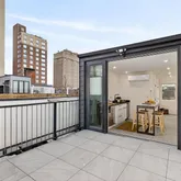 At the top, sliding glass doors open to a roof terrace with sweeping skyline views and integrated outdoor kitchen — a rare indoor-outdoor experience within one block of the Square.